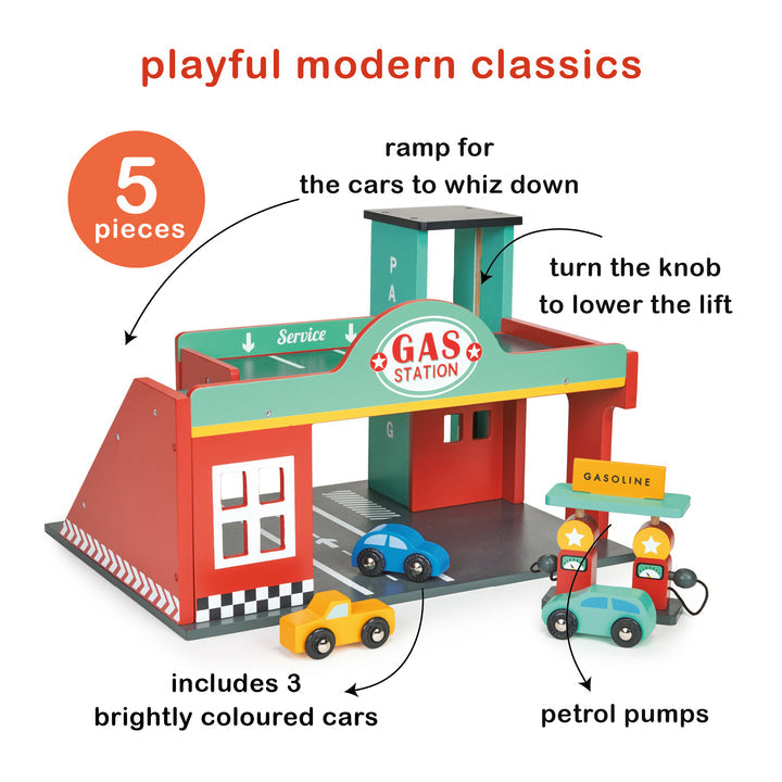 The Mentari Toys Gas Station is a wooden car garage and service station designed for imaginative play. Featuring a printed road baseboard, lift, and road-style ramp, children can enjoy endless driving and refuelling adventures.