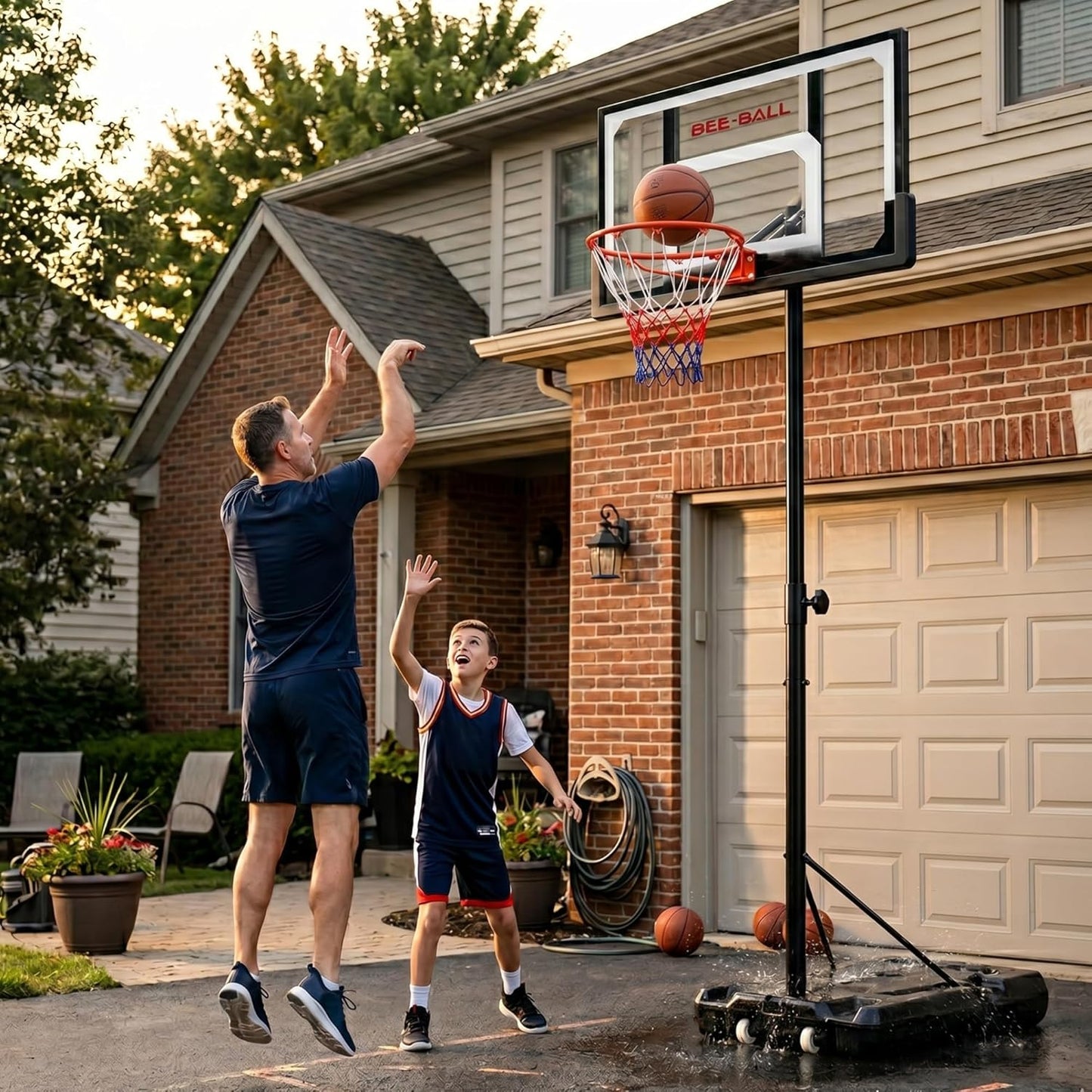 Bring professional basketball action home with the versatile Bee-Ball Portable Basketball Hoop & Stand!