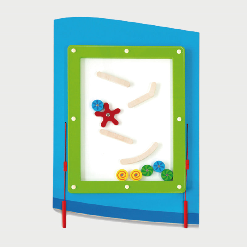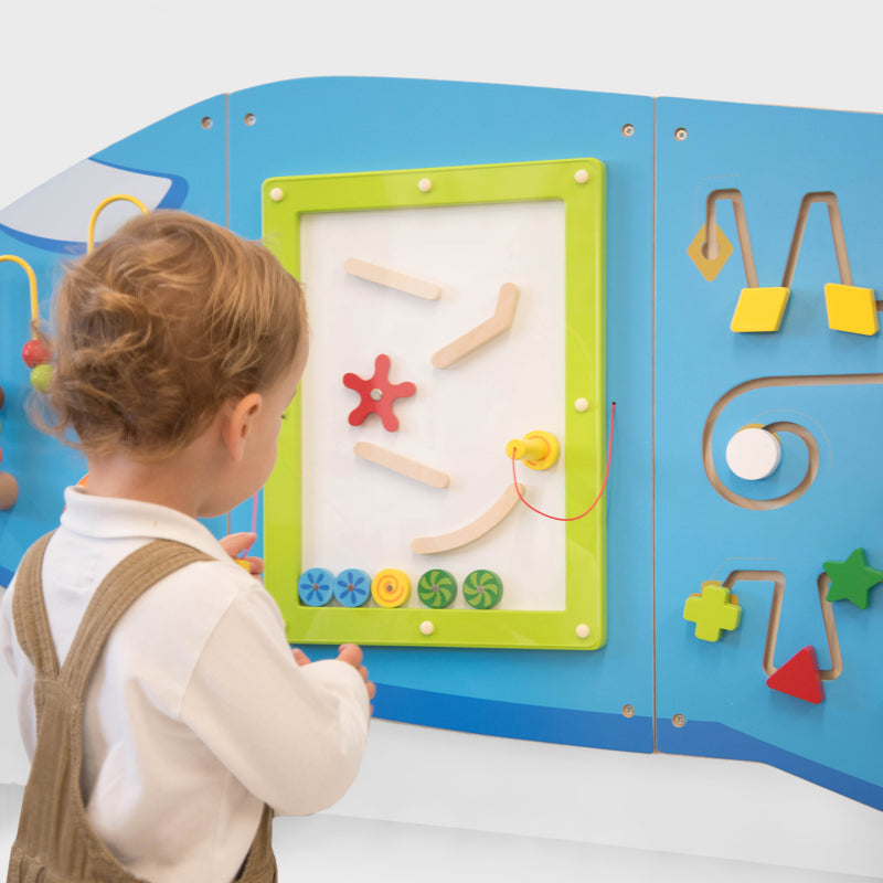 Made from durable MDF, this colourful wall-mounted toy features a clock with moving hands, a wire bead maze, magnetic pens, a shape maze, and interlocking gears. Perfect for both individual and group play, it encourages hand-eye coordination, problem-solving, and language development while brightening any play space.