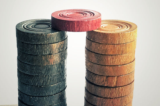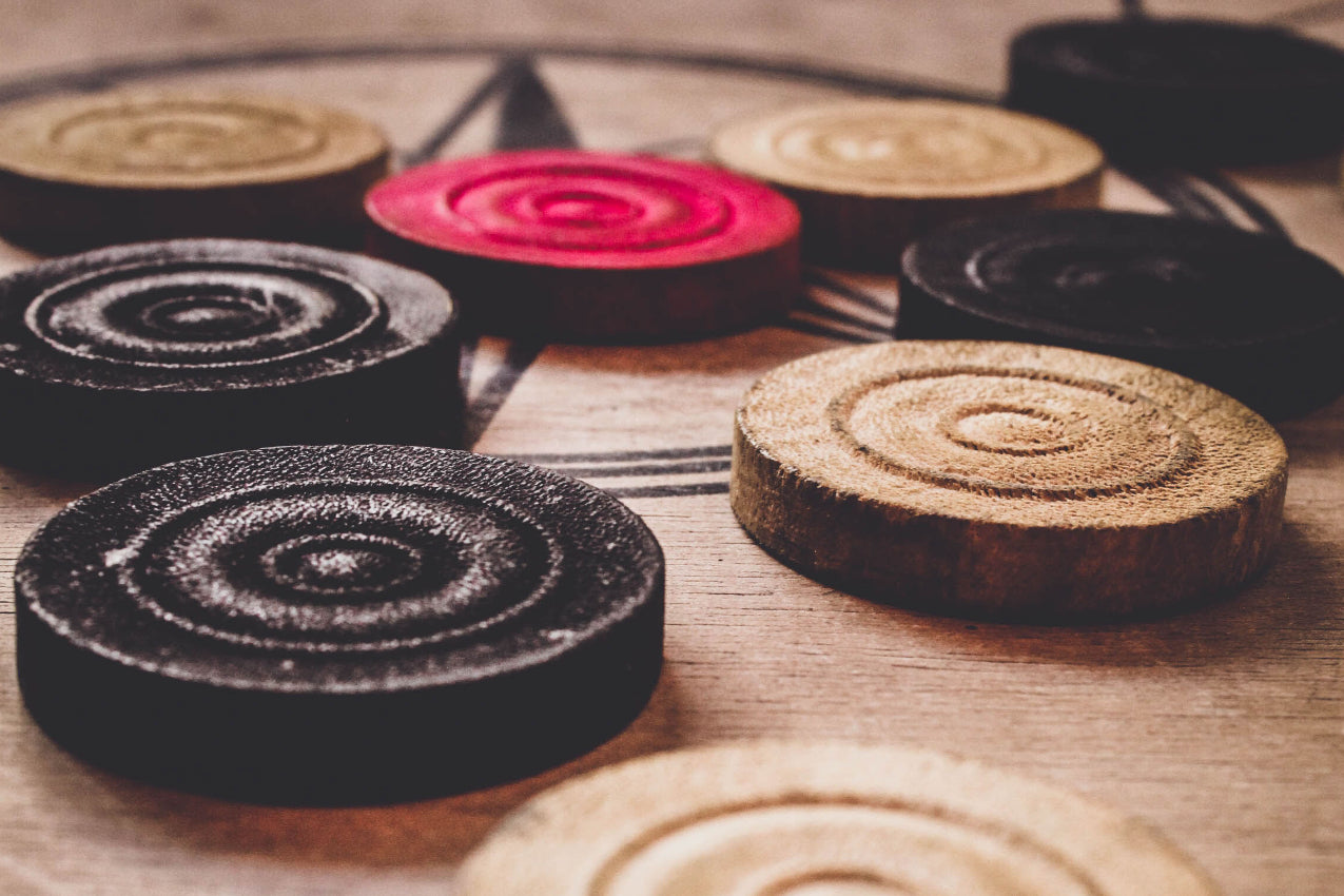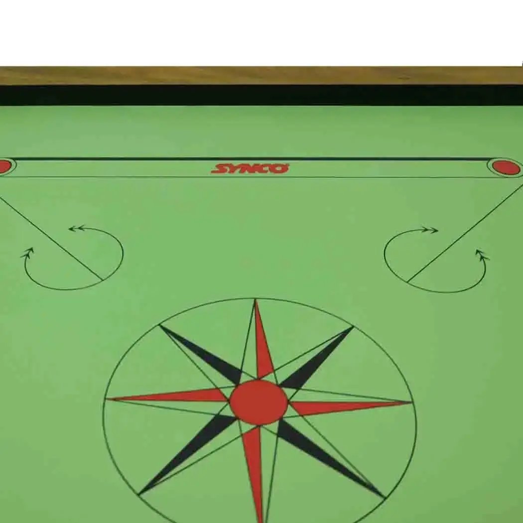 In Carrom the board, much like in chess or checkers, is the base where the game takes place. The standardized Carrom board needs to have a playing surface made of plywood or a similarly smooth and stable wood and cannot be less than 8mm thick. The official playing area needs to be a square measuring at 29" (74cm). The board itself will also be a square and its overall size will depend upon the dimensions of the frame which is made from different types of hardwood, such as rosewood.