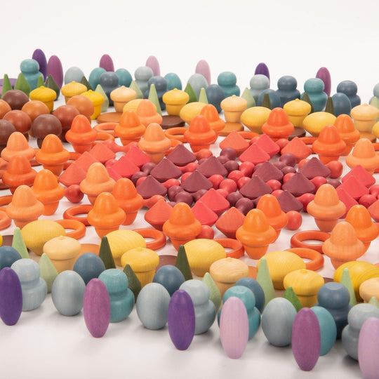 The attractive natural woodgrain shines through each shade, offering no ‘right’ or ‘wrong’ way to use the pieces. Children can explore freely, incorporating the treasures into imaginative stories, practising counting and sorting, designing patterns and sequences, or simply enjoying their tactile qualities. This versatile set supports logical thinking, creativity, hand-eye coordination, and fine motor skills.