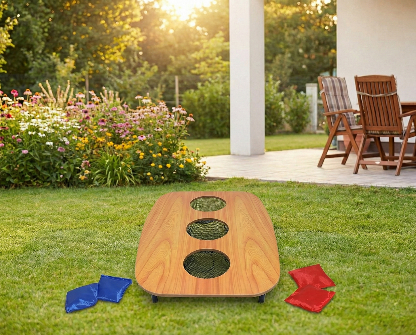 - Complete Set: Includes a single deck Cornhole board and 4 colourful bean bags (2 red, 2 blue).
