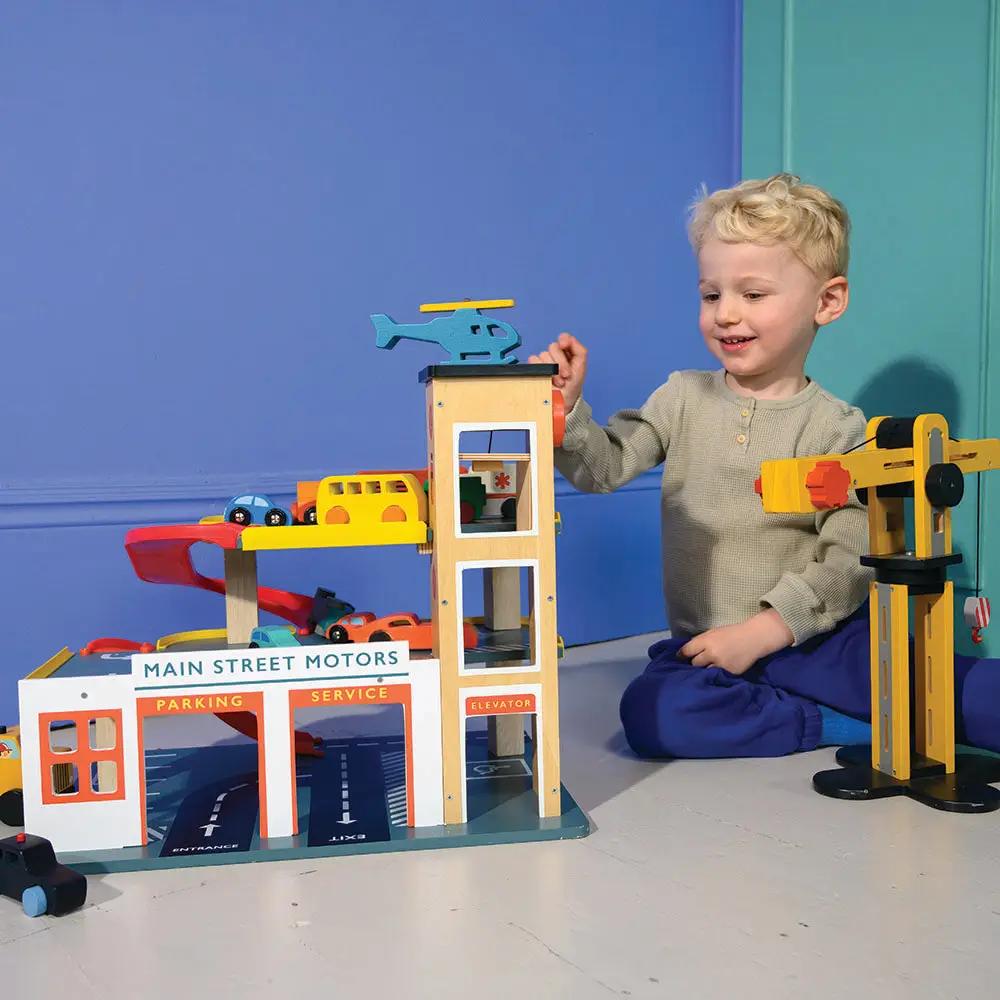 Main street Motors is open for business, a sturdy wooden toy garage with 3 levels and 2 ramps, a working lift to take 2 little toy cars up and down. Strong and brightly painted, there is also a helicopter and helicopter pad on top of the lift shaft. Each parking level is decorated with parking bays, and there is plenty of access all round for little hands to get in and manoeuvre the cars around.